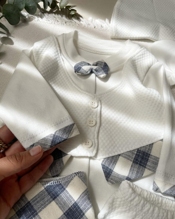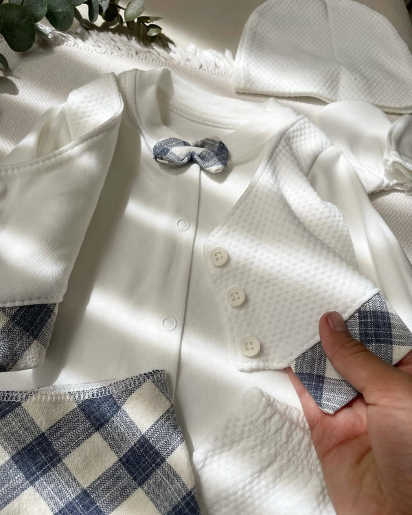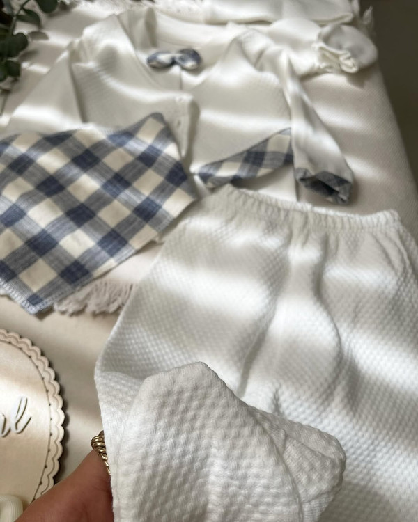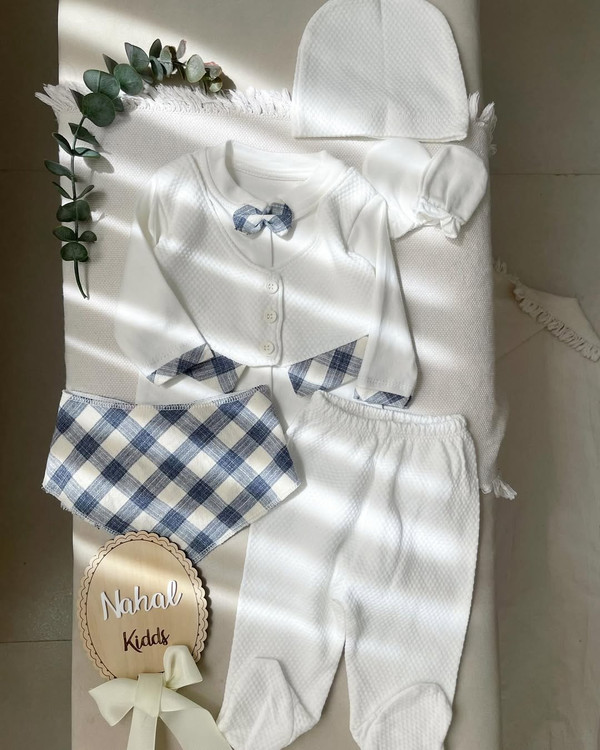 بیین یه ست برات اوردم که اگر سخت پسند ترین هم باشی قطعا انتخابش میکنی یه ست باکیفیت ترک از برندbebelinna که حرفی تو کیفیتش نیست عکسا دیگه واضحن تک سایز۰ه @nahal_kidds @nahal_kidds پنج تیکه شامل بلوز استین دار که کاملا جلوش دکمه میخوره شلوار جورابدار دستکش کلاه و پیشبند(دسمال گردن) بها۱/۲۰۰