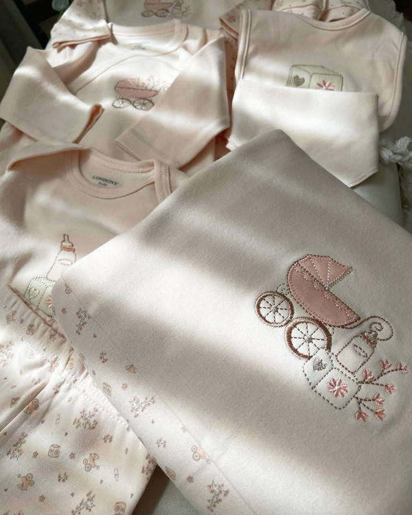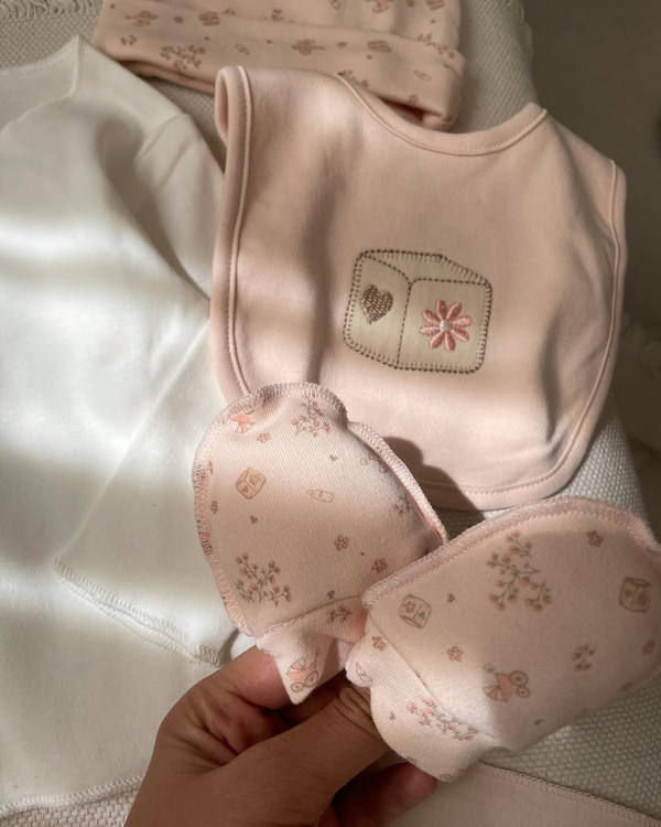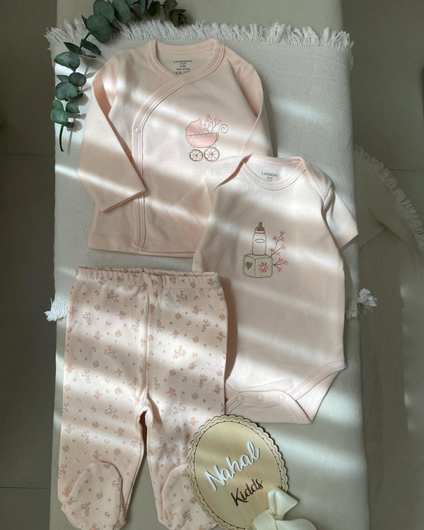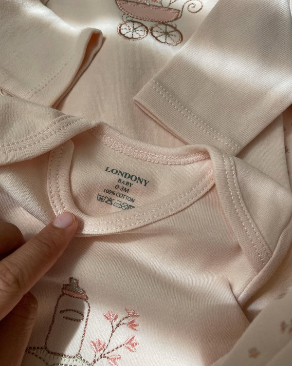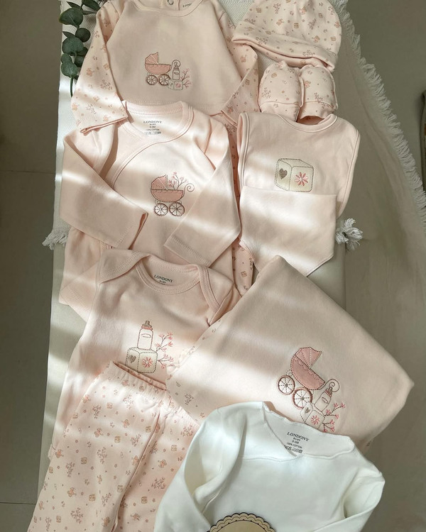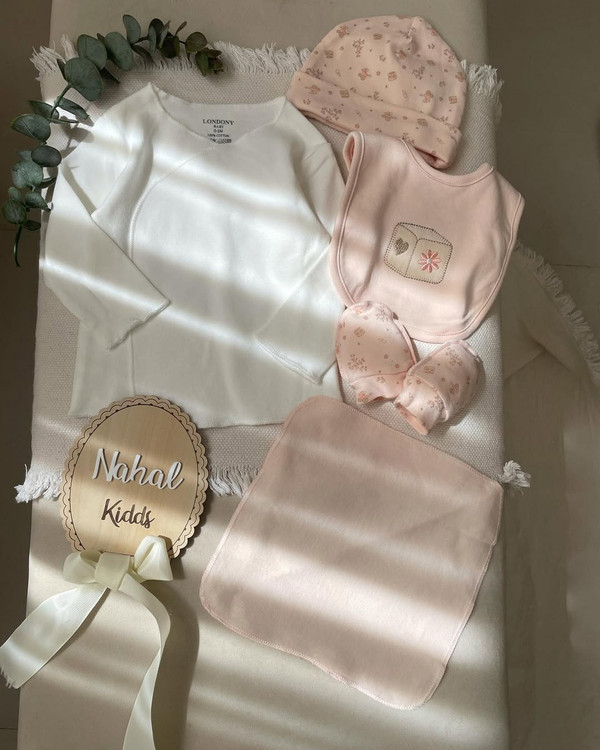 و این دفعه ده تیکه بیمارستانی وارداتی دخترانه از برند بینظیرlondony یک کار نخ پنبه بسیاااار لطیف و نرم ده تیکه شامل بلوز آستین دار بادی آستین کوتاه سرهمی پیشبند کلاه دستکش دورپیچ شلوار تک جورابدار دستمال یک بلوز سفید یقه دراپ سفید بدون دکمه(برای رویه ) همراه جعبه