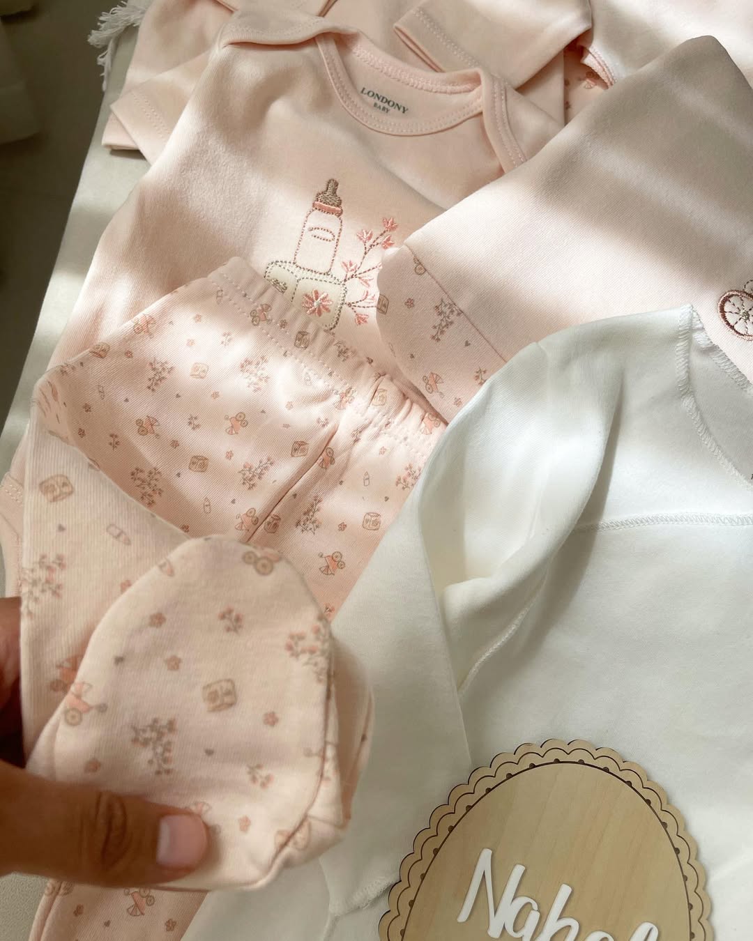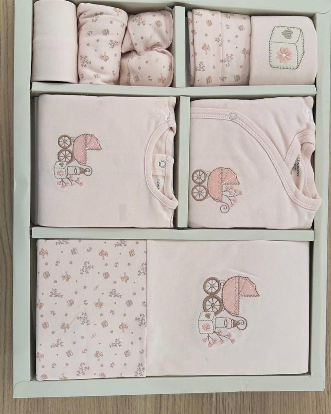 و این دفعه ده تیکه بیمارستانی وارداتی دخترانه از برند بینظیرlondony یک کار نخ پنبه بسیاااار لطیف و نرم ده تیکه شامل بلوز آستین دار بادی آستین کوتاه سرهمی پیشبند کلاه دستکش دورپیچ شلوار تک جورابدار دستمال یک بلوز سفید یقه دراپ سفید بدون دکمه(برای رویه ) همراه جعبه